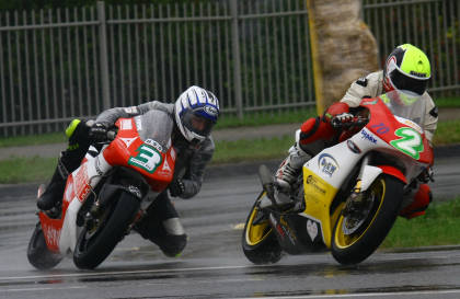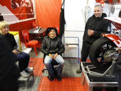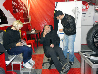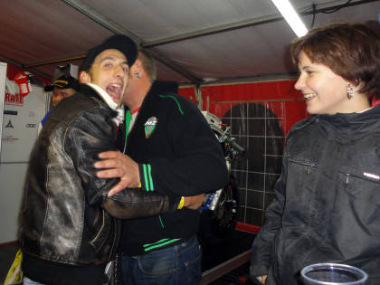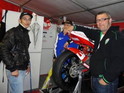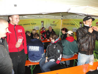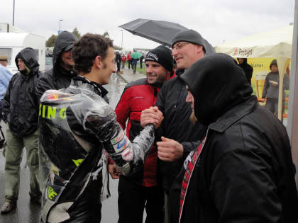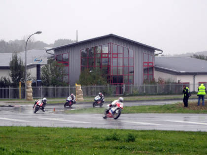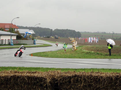 hi folks land unter...hieß es beim 48. frohburger dreieckrennen! Was hatten wir in all den jahren, in denen wir schon in frohburg am start waren, schon für wetter....das reichte von erbärmlicher kälte mit eiskratzen auf den autoscheiben bis hin zu hochsommerlicher, schweißtreibender wärme. Ganz sicher gab es in all den jahren auch den einen oder anderen regenschauer aber das, was uns und all die rennfans an diesem rennwochenende erwartete haben wir in frohburg so noch nie erlebt....es regnete von samstagmorgen bis zum sonntagnachmittag nahezu ohne unterbrechung durch !!!!!!!!!!! Es dauerte nicht lange, da verwandelten sich die wiesen, auf den die zelte und wohnmobile der teams standen in feuchtbiotope und die felder rund um die strecke, auf denen die zuschauer das renngeschehen verfolgen sollten wurden zu sümpfen......real raodracing könnte man sagen. Ähnliches wetter habe ich bisher nur beim ulster grand prix 2008 erlebt, als wir 6 tage mit starkregen erleben durften...am ende wurden die rennen des ulster garnd prixs wegen unzumutbarer streckenverhältnisse abgesagt und wir waren mal eben umsonst nach nordirland gereist. Aber wie auch immer, es gibt eine positive sache an solch außergewöhnlichen umständen.....es sind genau diese rennen, über die man dann jahre später noch spricht....weißt du noch 2010 das scheißwetter in frohburg, wird es in einigen jahren dann heißen....und dann könnt ihr mit stolz geschwollener brust behaupten, dass ihr dort dabei gewesen seid....is doch auch was...grins Um es auch gleich am anfang des rennberichts zu erwähnen, ich ziehe vor allen rennbesuchern den hut, die nach frohburg zum rennen gekommen sind um bei diesem dreckswetter die aktiven und den veranstalter damit zu unterstützen !...fette zusatzpluspunkte gibts dann natürlich noch für die, die das ganze wochenende ausgeharrt haben und dem regen getrotzt haben - vielen dank an euch alle ! Auch für die piloten war es kein einfacher job. Eine naturrennstrecke hat bei nässe natürlich besondere tücken, speziell die weißen fahrbahnmarkierungen können unheimlich rutschig werden bei nässe und stellen ein zusätzliches sturzrisiko für die rennpiloten dar. Wie ja aus den vergangenen newszeilen zu lesen war, hatten wir dieses jahr etwas chaos bei der organisation des frohburger events und es wäre beinahe der fall gewesen, dass unser team aufgrund der späten anmeldung nicht zum start zugelassen worden wäre. Erst in allerletzter minute konnten wir dann glücklicherweise noch alles klar machen und konnten lucy glöckner (125cc) und toni wirsing (250cc) für unser team nachmelden, dafür von hier aus nochmal ein herzliches dankeschön an die organisatoren des frohburger dreieckrennens, die wieder einen super job gemacht haben und sicher auch besseres wetter verdient gehabt hätten....aber das thema hatten wir ja schon. Kommen wir zum renngeschehen selbst...man könnte es vorab gesagt als "durchwachsen" bezeichnen. Durch einen, eigentlich recht harmlosen, trainingssturz von lucy im ersten zeittraining der 125iger klasse wurden leider alle hoffnungen auf eine topplatzierung für lucy zu nichte gemacht...denn leider verletzte sie sich bei diesem sturz so unglücklich, dass es für sie an diesem wochenende nicht mehr möglich sein sollte, weiter an der veranstaltung teilzunehmen. Eine schleimbeutelverletzung an lucys rechtem arm war doch schwerwiegender als zunächst erwartet und so gab es am sonntagmorgen kein OK vom rennarzt... sicher die richtige und vor allem die beste entscheidung für lucys gesundheit. Selbstverständlich waren alle und speziell lucy sehr geknickt, denn mit so einem verlauf des wochenendes hätte wohl keiner gerechnet....aber das ist halt rennsport, so abgedroschen es auch klingen mag. Kopf hoch heißt es da, auch wenn für lucy der saisonabschluss damit gründlich nach hinten losgegangen ist.....ich denke aber, dass lucys 3.gesamtrang im diesjährigen yamaha-cup für einiges entschädigt und auch bei lucy am ende die positiven erinnerungen an diese saison überwiegen werden. Das zweite "eisen", das wir im frohburger feuer hatten, war toni wirsing, der chemnitzer wildfang und letztjährige BMW superbikepilot. Wir kennen toni wirsing noch von vielen spannenden 250cc rennen, die er sich mit unserem damaligen piloten alan györfi in der europameisrterschaft geliefert hat...zum damaligem zeitpunkt war es für unser team allerdings weniger erfreulich, dass toni am ende meist die nase vorn hatte im vergleich mit unserem ungarischem fahrer...;-) Wir waren froh, dass wir uns sehr kurzfristig mit toni einigen konnten und ihn sozusagen in allerletzter minute für das frohburger rennen in unser team holen konnten. Auch wenn toni seit über eineinhalb jahren auf keinem 250iger motorrad mehr gesessen hat und gleich recht noch nicht auf dem frohburger kurs unterwegs war, erhoffte ich mir aufgrund tonis talents einiges von ihm. Einziges bedenken, das ich ehrlich gesagt hatte war jenes, dass toni eventuell zu motiviert an die sache herangehen würde...soetwas könnte auf einem straßenrennkurs verheerende folgen haben. Meine bedenken waren aber zum glück unberechtigt denn toni hat schon im ersten training gezeigt, dass er ein profi ist und hat perfekt alles umgesetzt, was wir mit ihm abgesprochen haben. Schon nach wenigen runden eingewöhnungszeit konnte toni schnelle rundenzeiten vorlegen und rangierte damit auf dem vierten platz des ersten zeittrainings. Die widrigen wetterumstände sind toni dabei natürlich auch nicht gerade hilfreich engegen gekommen, aber auch im zweiten zeittraing verbesserte toni seine rundenzeiten kontinuierlich....leider ging uns aufgrund eines boxenstopps etwas an trainingszeit verloren und gerade als toni den richtigen trainingsspeed gefunden hatte, wurde das training abgewunken.....da war unser kleiner chemnitzer racer aber so richtig sauer !!!! feix ! Mit seiner persönlich besten rundenzeit reichte es für startplatz 6 im feld der knapp 40 rennpiloten