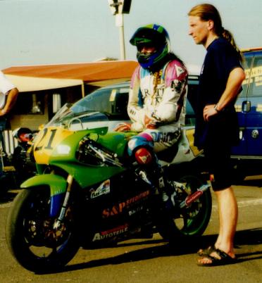 konnte aber gleich gelöscht werden. Resultat: Schulterverletzung mit Knochenabsplitterung sowie einige Prellungen/Abschürfungen bei Rico und etliche Schäden an der Maschine. In der Nacht von Freitag auf Samstag besuchten Mechaniker Ziegel Altmann und Rico zuerst das Freiberger Krankenhaus und anschließend Frank Ziprian bei Mittweida, um die Auspuffanlage in der dortigen Spezialwerkstatt zwischen 22.00 Uhr und 24.00 Uhr zu richten. Hier ein herzlicher Dank an Frank. Die Gabel hat einiges abbekommen, funktioniert aber noch, die Verkleidung ist Schrott und wurde vorerst mit Blindnieten und Tape fahrfertig gemacht. Die wichtigen Teile wie Rahmen, Motor und Fahrwerk blieben aber unbeeindruckt und funktionierten. |